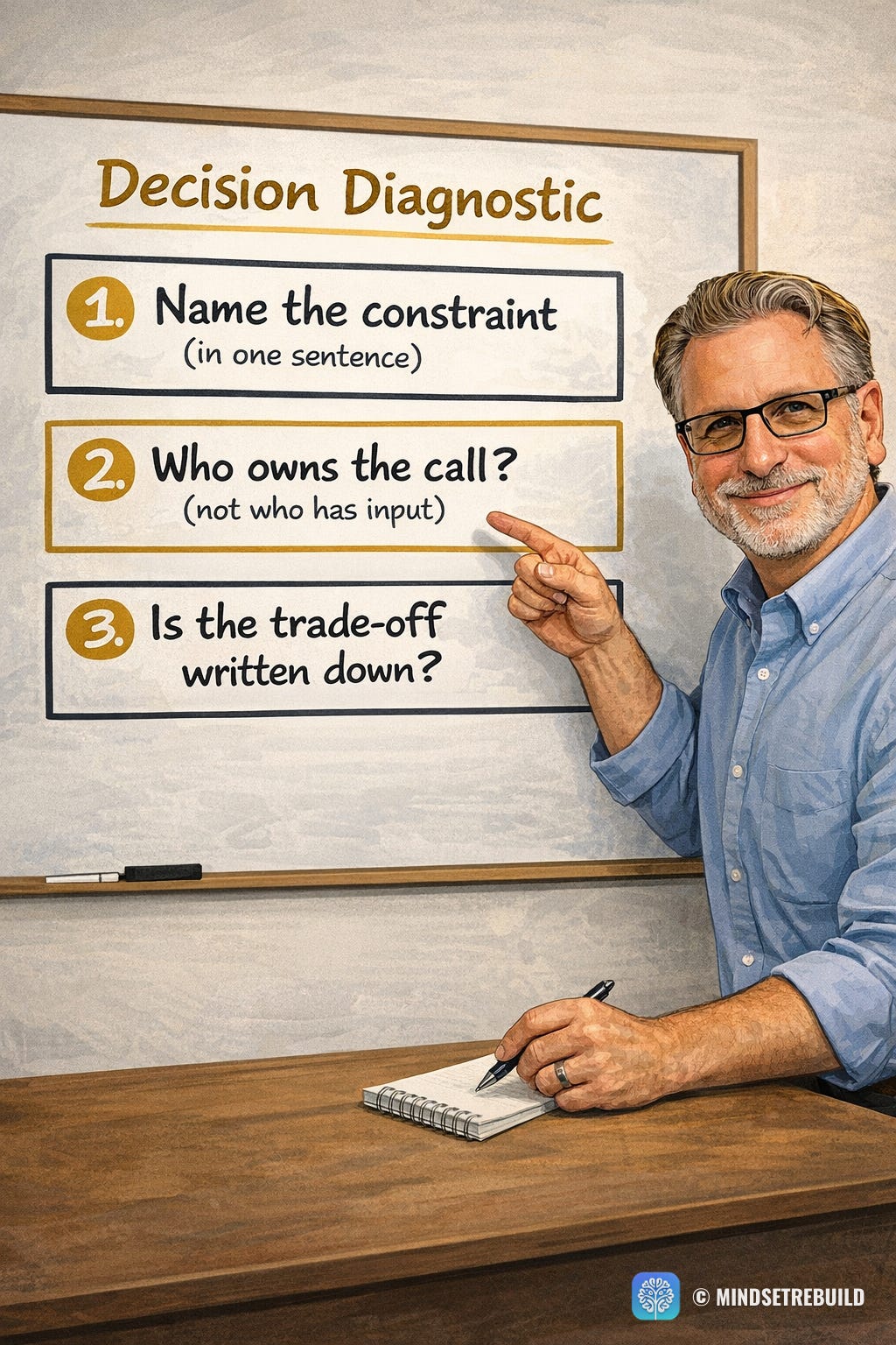 If a decision has been “in discussion” for weeks and nobody can name the constraint, the decider, and the written trade-off, you’re not stuck on execution. You’re stuck because the decision can’t pass a simple three-question test. This is a quick look at that diagnostic and how it gets decisions moving again.